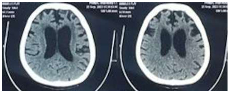 What she was trying to convey was that after waking up, she made her bed to keep it tidy. The patients also showed impaired comprehension. When assessed using TADIR, the patients had impairment in understanding the syntactically complex sentence. For example, for the question “Seorang bayi lebih besar daripada seorang dewasa. Benar atau tidak?” (A baby is bigger than an adult. True or false”), she answered true. In the sentence production test using pictures, she was asked to make a sentence from a picture, but she could only mention the objects and not make a sentence. The imaging results of one nfvPPA patient revealed atrophy in both frontal lobes, with more pronounced atrophy on the left side, as illustrated in Fig. (1).