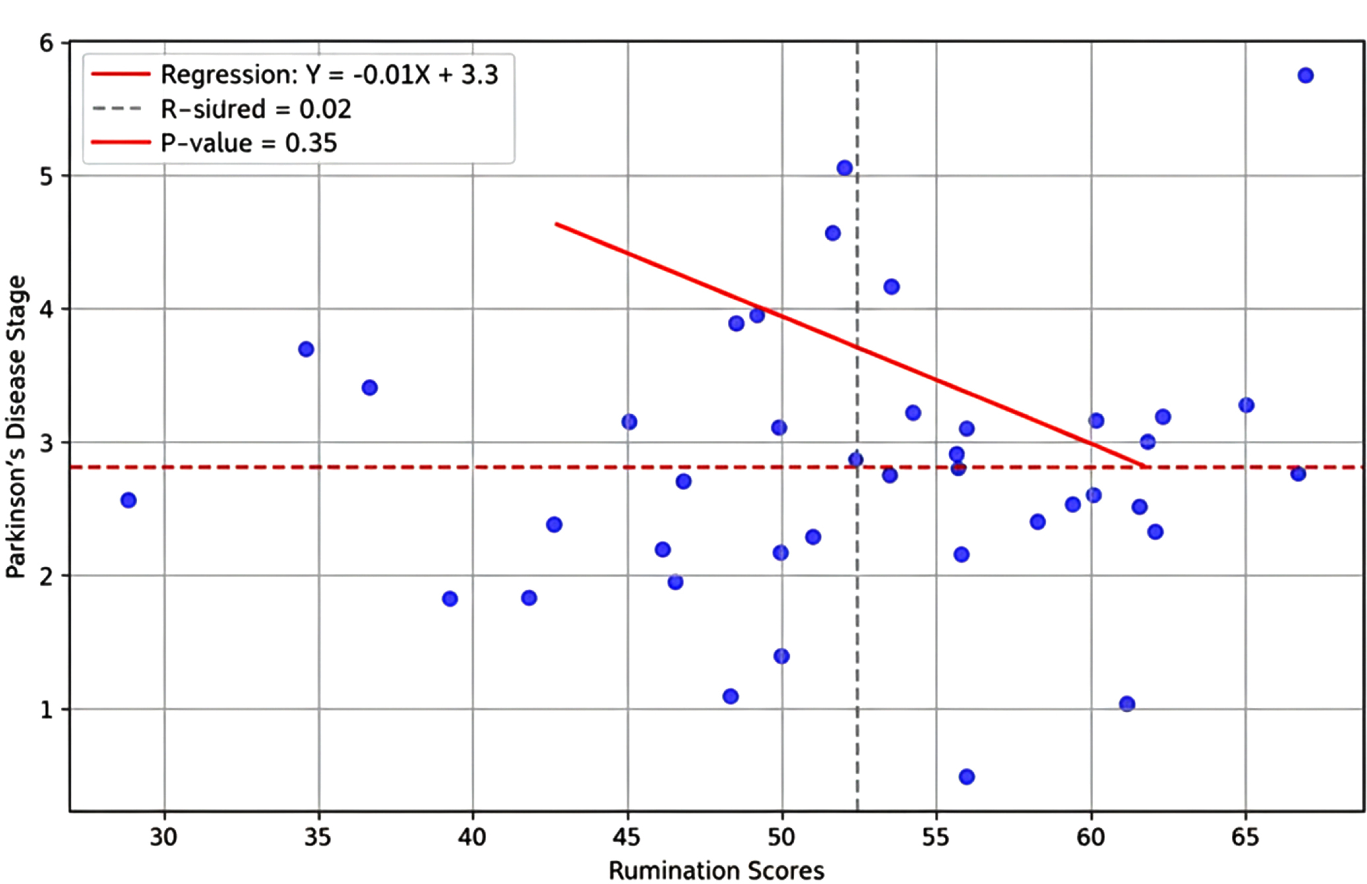 The scatter plot shows a positive correlation between rumination scores and Parkinson’s disease stage, indicating that higher levels of rumination are associated with more advanced disease stages. Axes: X = Rumination Score (22-88), Y = Hoehn and Yahr Stage (1-5). Trend line: y = 0.037x + 1.0, R2 = 0.126. 95% CI for slope [0.01, 0.06] (Fig. 1).