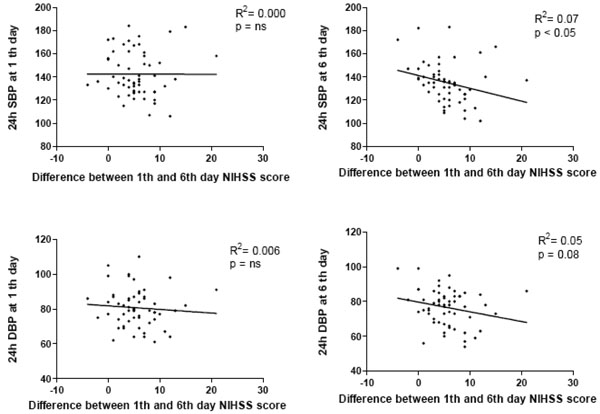 The entity of NIHSS reduction at sixth day did not correlate with basal 24 hour systolic BP values, whereas it was inversely correlated with 24 hour BP values at the sixth day (R2: 0,07; p<0,05) (Fig. 2).