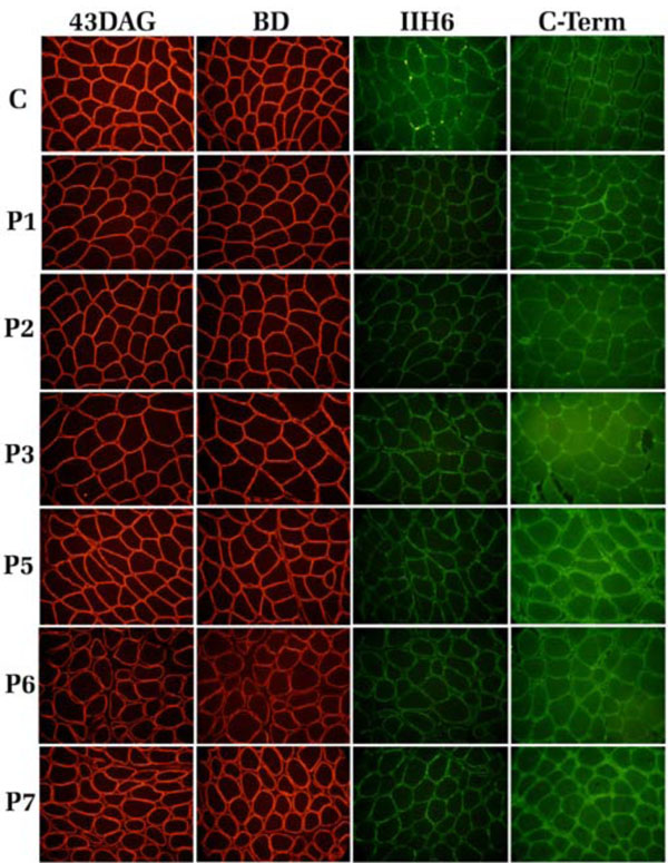 Immunofluorescence analysis of the DG subunits was performed on skeletal muscle cryosections of all patients, with the exception of P4, using a panel of antibodies hitting different epitopes within the α- and β-DG subunits, as depicted in Fig. (1). The β-DG subunit was stained with two different antibodies hitting the extracellular region (BD) and the cytoplasmic domain of the protein (43-DAG). The β-DG signal in all the samples analyzed was comparable with the control section, and showed normal sarcolemma expression (Fig. 2). Also the membrane localization of the α-subunit was normal when detected with a polyclonal antibody raised against the core protein of the C-terminal domain of α-DG: furthermore, the positive staining with an antibody raised against the carbohydrate molecules revealed the correct glycosylation of the α-subunit in all patients (Fig. 2).