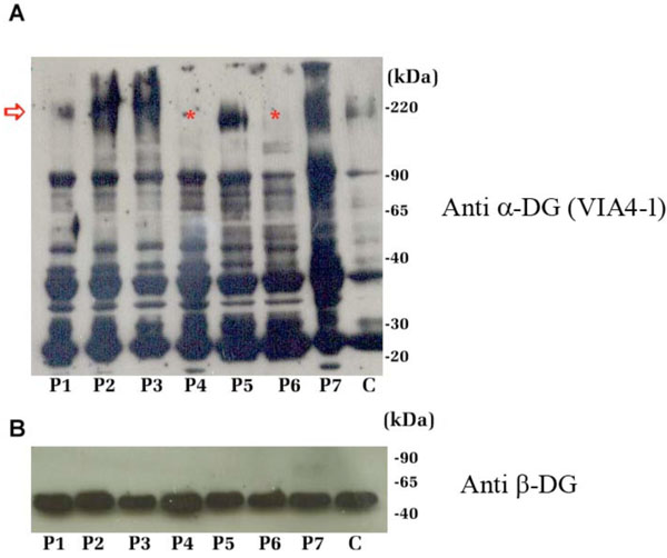 Western blot analysis of the DG subunits in total protein extracts from patients P1-P7 and from control muscle tissue (C). A: Samples were resolved with a 7.5-15% acrylamide gradient SDSPAGE and α-DG was detected with the antibody VIA4-1 (lot 32685) raised against an undefined carbohydrate epitope (red arrow). In samples P4 and P6 the expected 156 KDa band was absent (red asterisk). The additional lower bands detected in all the samples might correspond to hypoglycosylated and/or proteolytic forms of α-DG; B: Western blot upon a 12% SDS-PAGE of the total protein extracts using anti 43DAG/8D5 for β-DG detection. All the samples showed the expected 43 kDa band.