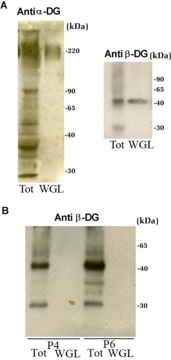 The total protein extracts of patients P4 and P6, which showed an anomalous signal of α-DG in Western blot, were submitted to a lectin-enrichment protocol using wheat germ lectin (WGL) beads that specifically bind to N-acetylglucosamine residues. This protocol is very useful for the analysis of the carbohydrate decorations of a glycoprotein like α-DG. In the normal tissue sample, WGL-enriched fractions contain both α- and β-DG subunits (Fig. 4A). The WGL-enriched fractions from patients P4 and P6, analyzed with an antibody against β-DG, showed a loss of immunodetection in comparison to the corresponding total protein extract (Fig. 4B).