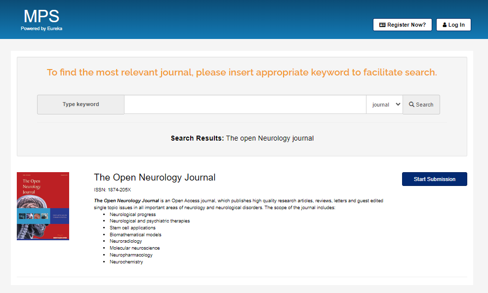MPS is a user-friendly system that can be conveniently operated. The system allows rapid and easy submission of original and revised manuscripts and indicates their status throughout the submission process. Authors accessing the system for the first time will be required to Register themselves online at https://bentham.manuscriptpoint.com/index.php/Login/show_login and create an MPS account to submit a paper to a particular journal from the available list in the registration form.